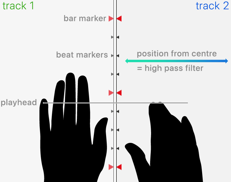 Then, a second track being brought in, with a matching visual of these beats, allowing the player to do the matching. As the second track is brought alongside the first, a high pass filter brings in the lower frequencies, and like some magnetic blocks, they click together perfectly.